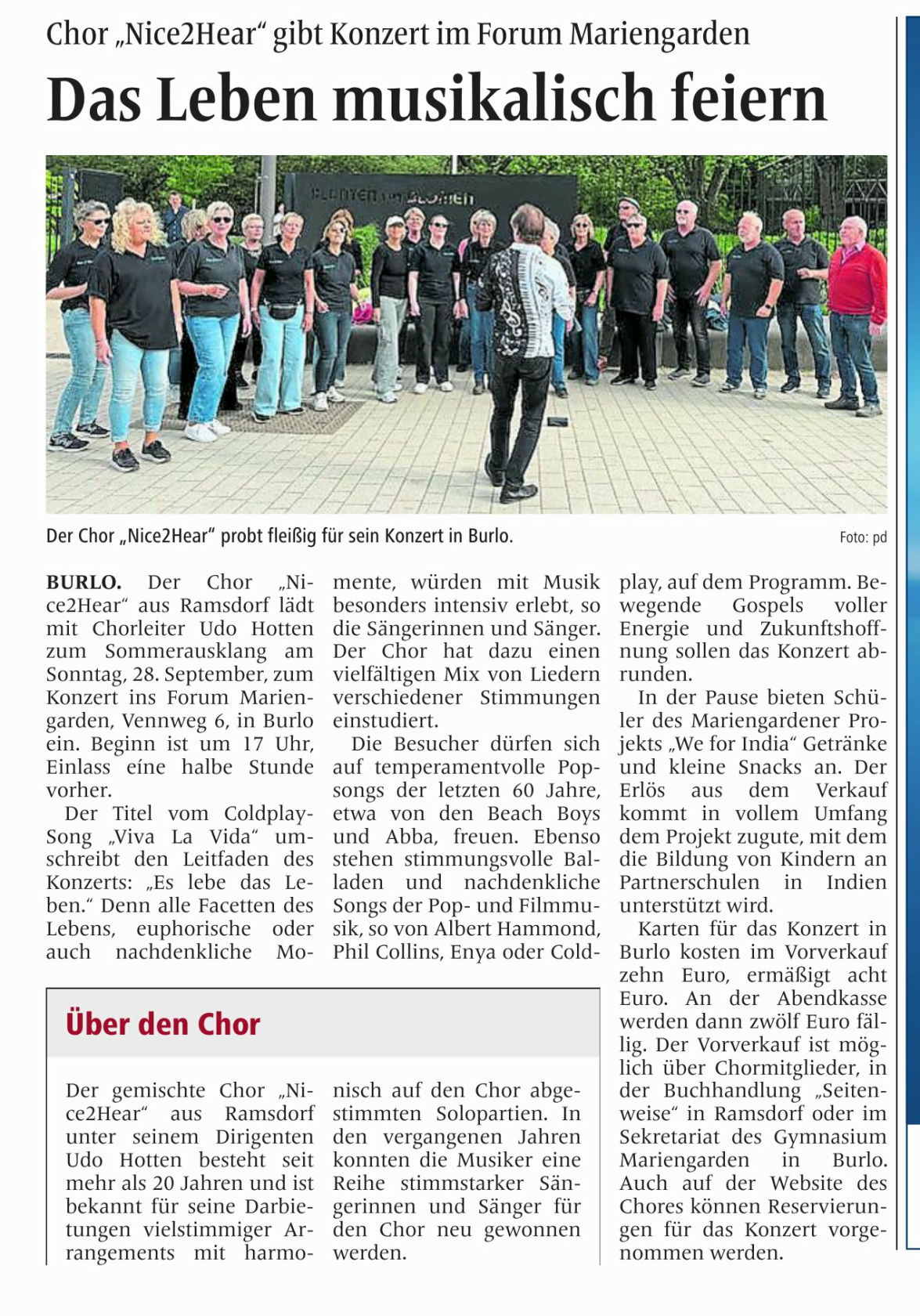 BURLO/RAMSDORF (pd).Konzert mit dem Chor Nice2Hear am Sonntag, 28.9.2025, 17 Uhr Forum Mariengarden 46325 Borken-Burlo, Vennweg 6